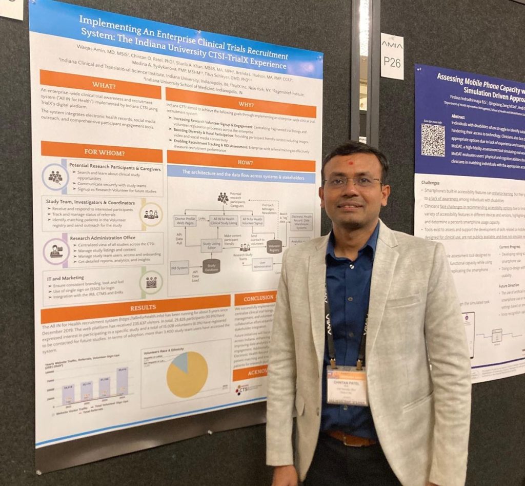 Our Cofounder and CTO, Dr. Chintan Patel was at the AMIA Informatics Summit 2025 presenting about “All IN for Health” – An enterprise-wide clinical trial awareness and recruitment system implemented by Indiana CTSI using TrialX’s digital platform. The system integrates electronic health records, social media outreach, and comprehensive participant engagement tools. Learn More.