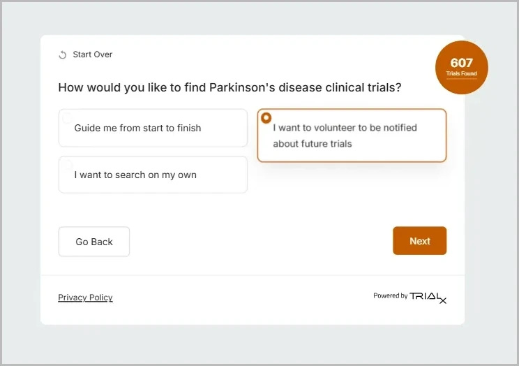 The guided search option provides a step-by-step overview of clinical trials—what they are, the benefits of participation, and what patients can expect. The “Clinical Trial Primer” link helps participants learn more about the risks and benefits of each study, helping eliminate uncertainty and build trust in the process.