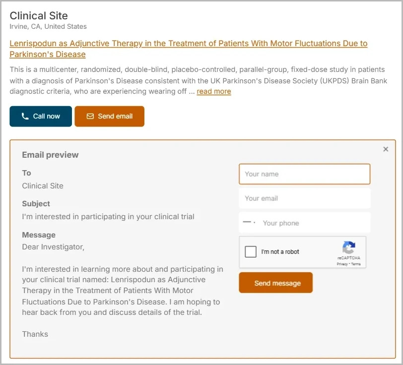The TrialX Clinical Trial Finder streamlines communication with clinical trial coordinators or study sites by offering “Call Now” and “Send Email” buttons, along with pre-written email templates. These features remove barriers like difficulty contacting the right person or uncertainty about how to get in touch, making it easier for potential participants to move forward with enrollment.