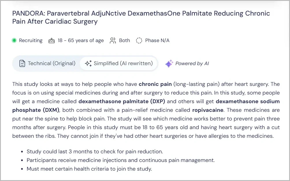 Many people find it overwhelming to navigate hundreds of clinical trials, interpret complex medical jargon, and identify the ones that are most relevant to them.